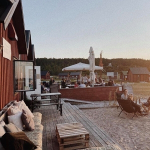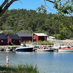 Det är några hundra meter till stranden från semesterbyn. Vid hamnen går det att bada från bryggan, klapperstranden eller mindre sandstrand.